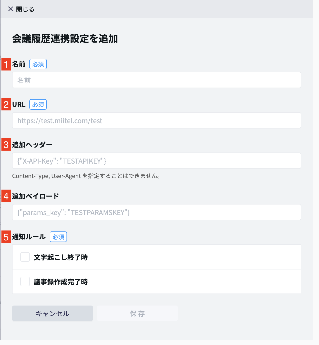 - 文字起こし完了時: 会議履歴の音声分析(文字起こし)完了時にトリガーされます。ペイロードに